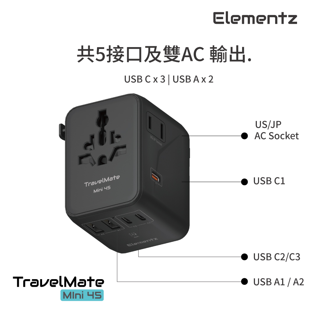 | USB C x 3 + USB-A x 2, (45W Max), Charge up to 5 devices simultaneously. |